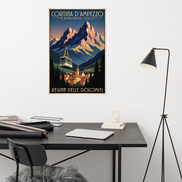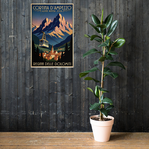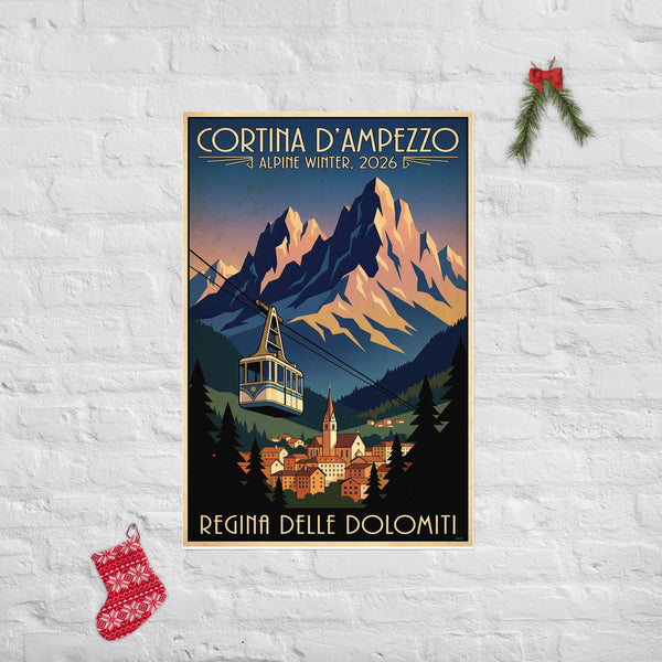 - What This Is: Original Art Deco–inspired Cortina d'Ampezzo ski travel poster (2026 edition).