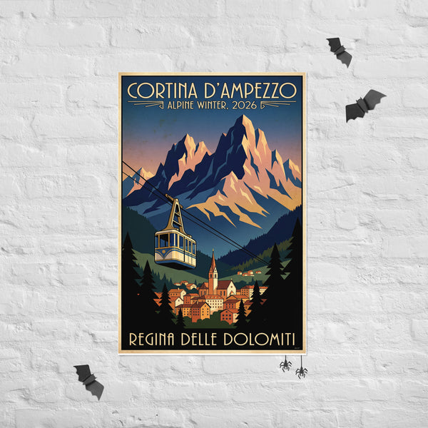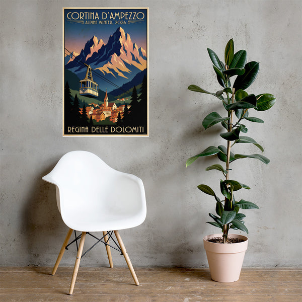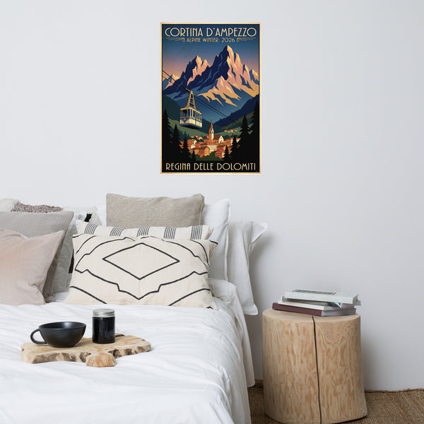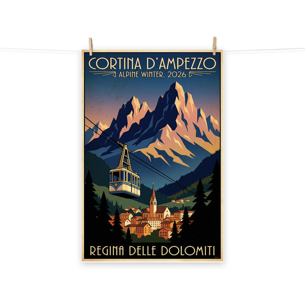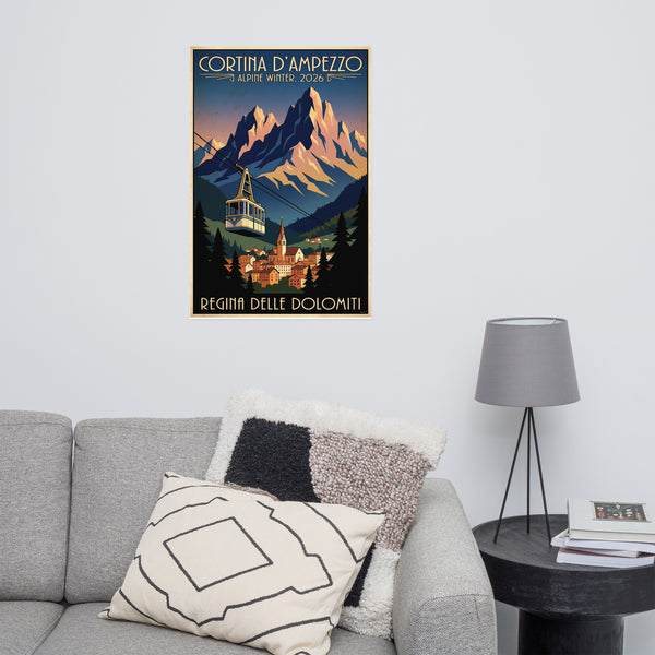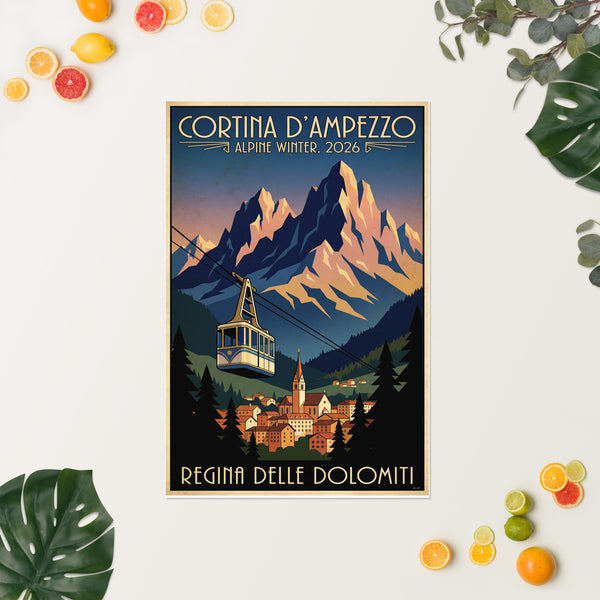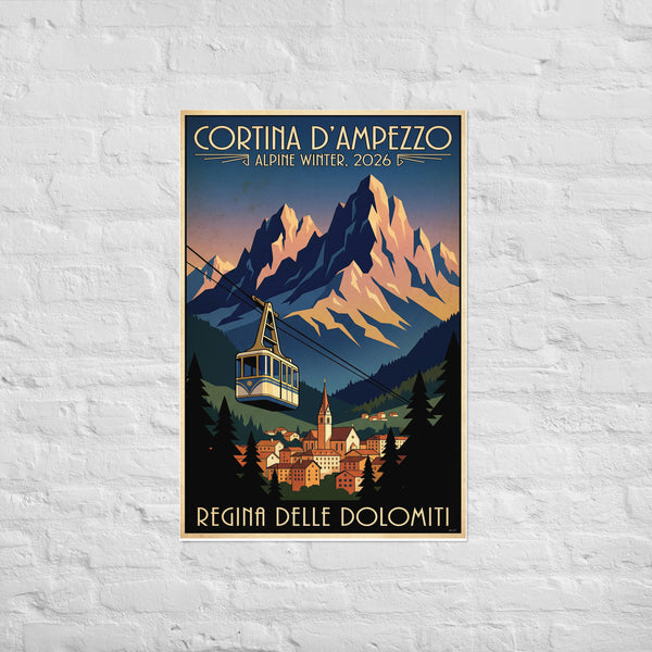 This poster is a collector's alternative to official merchandise, celebrating the place and its history, not the event's branding. It captures the spirit of Cortina's return to the world stage through the lens of its own design legacy. The Art Deco style connects the 2026 moment to the golden age of alpine tourism, while the focus on the cable car and bell tower highlights the valley's unique blend of natural beauty and human ingenuity. This is not a poster about an event; it's a poster about a place, and its enduring power to capture the imagination of the world.