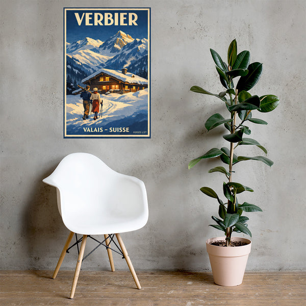 Yet beneath this contemporary layer lies an older continuity. Verbier’s enduring image is not speed or spectacle, but return: skis carried home at dusk, windows glowing against deep snow, and shelter offered in a severe landscape. This balance between vast mountain terrain and human refuge defines Verbier’s place in alpine history — and is the moment this poster preserves.