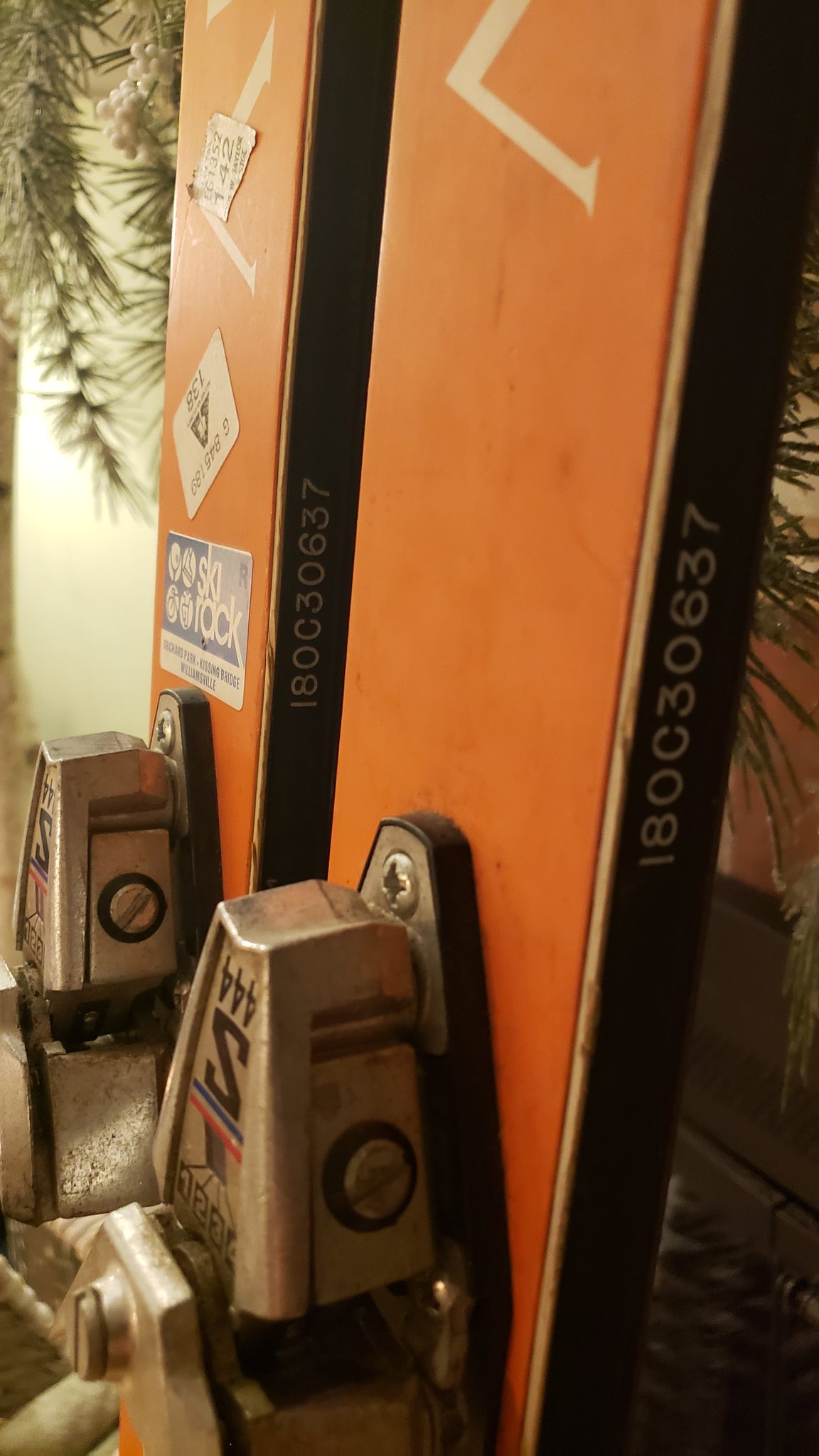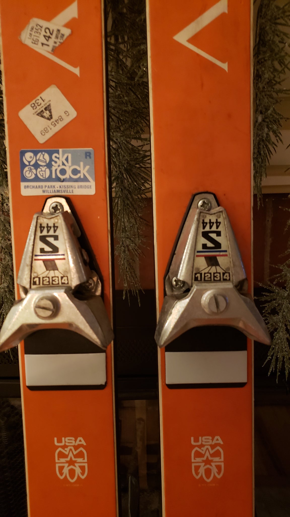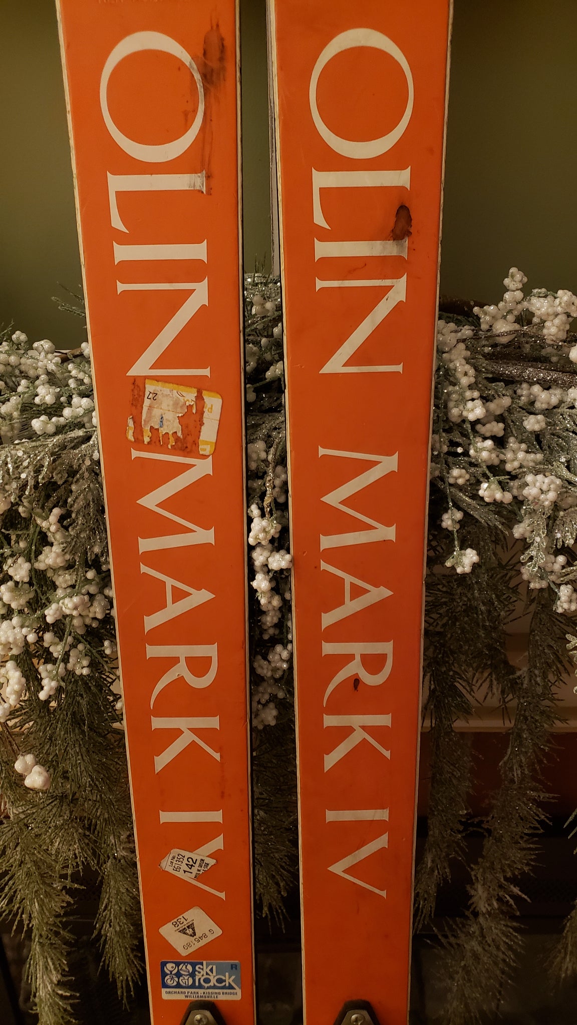This pair of OLIN MARK IV COMP IV skis, serial number C30637, is an unmolested, pre-owned set preserved from typical repurposing such as ski chairs or coat racks. The skis retain their original orange and blue color scheme, emblematic of the era and model. The included Salomon S444 bindings are considered suboptimal and are recommended to be replaced with modern bindings such as the LOOK Pivot 15-18 for optimal performance. The edges show signs of rust and will require tuning, including knocking back the edges to restore proper function. With a fresh set of bindings and edge maintenance, these skis are ready to be ridden or displayed as vintage ski memorabilia.