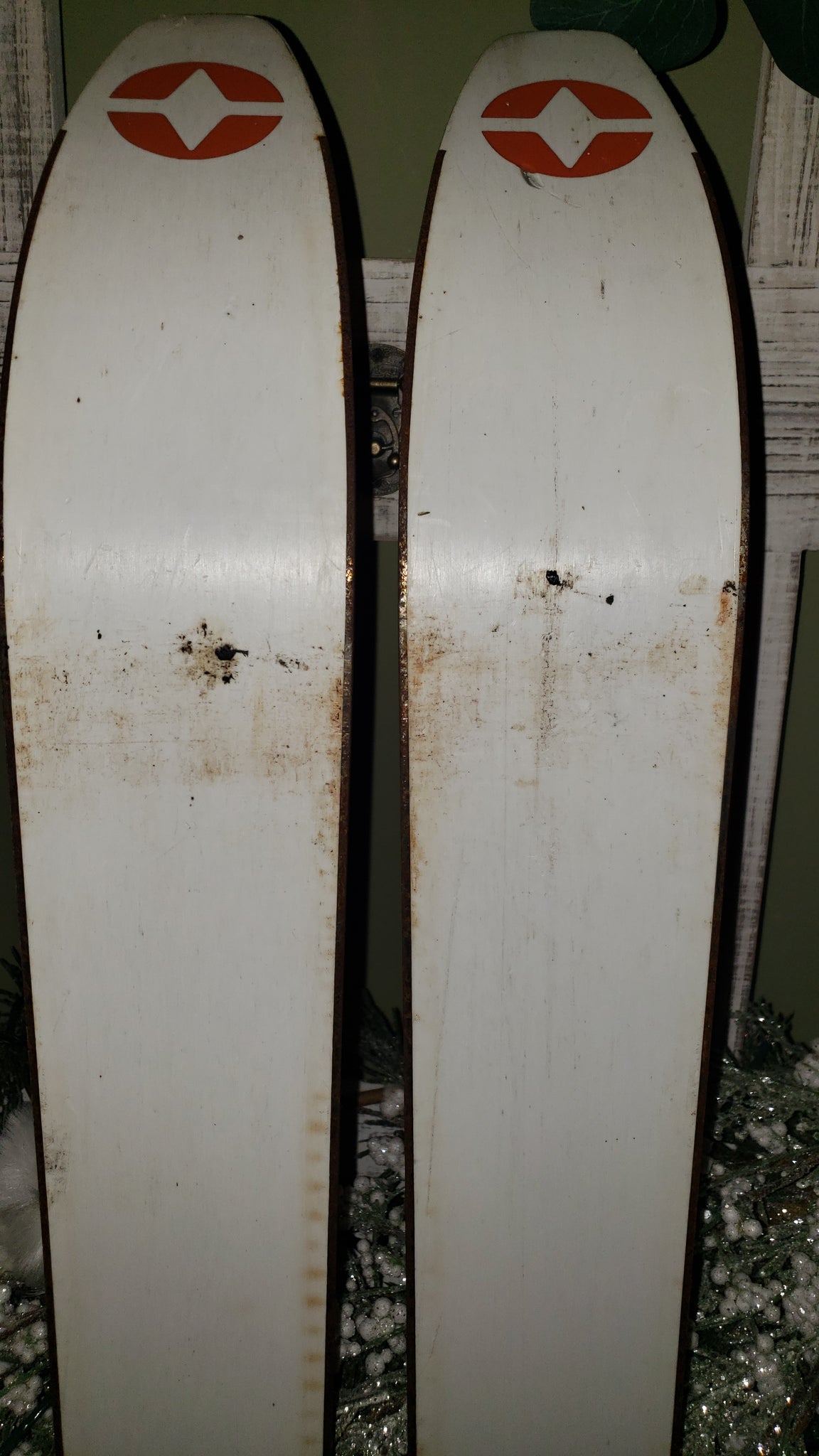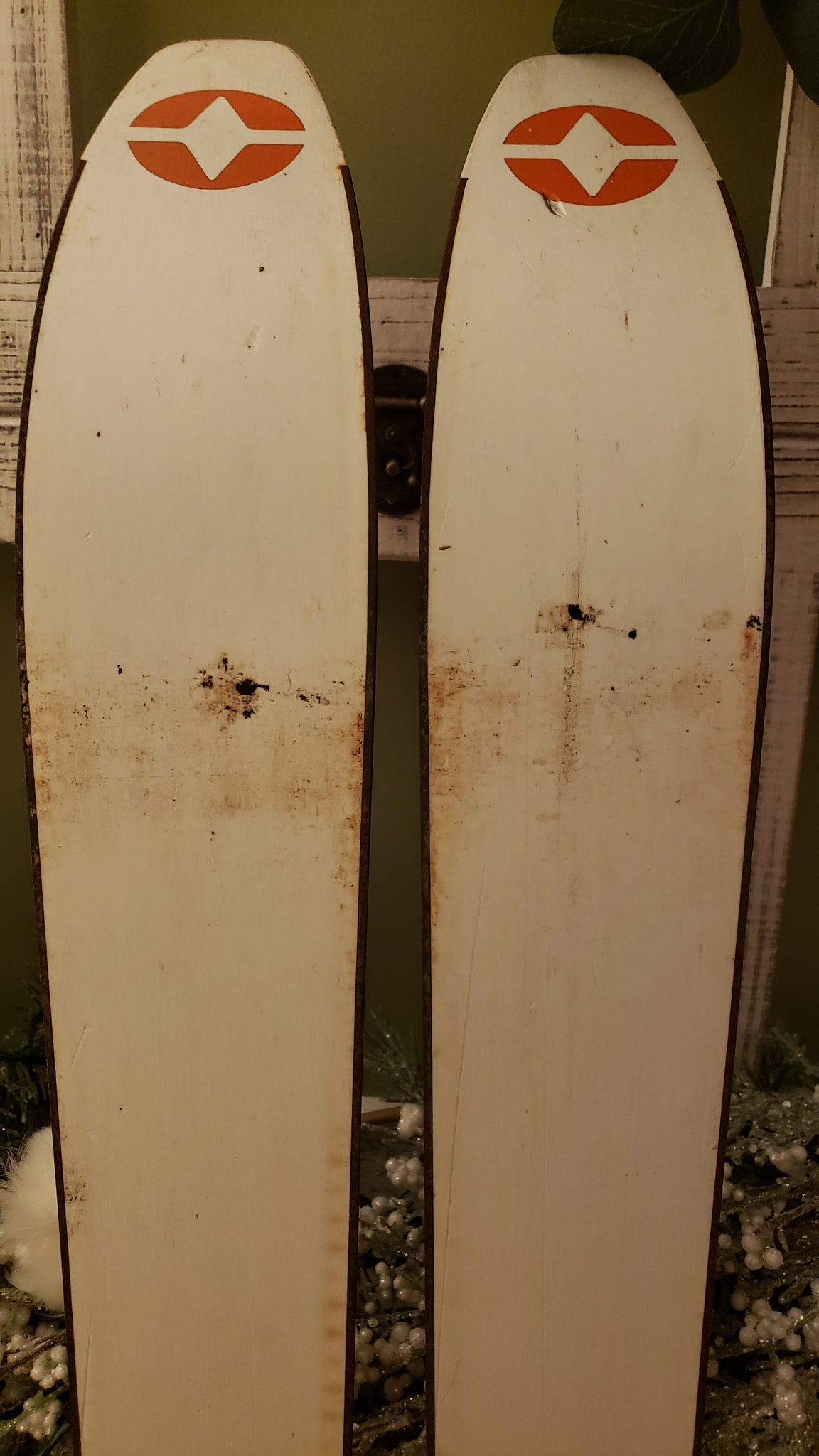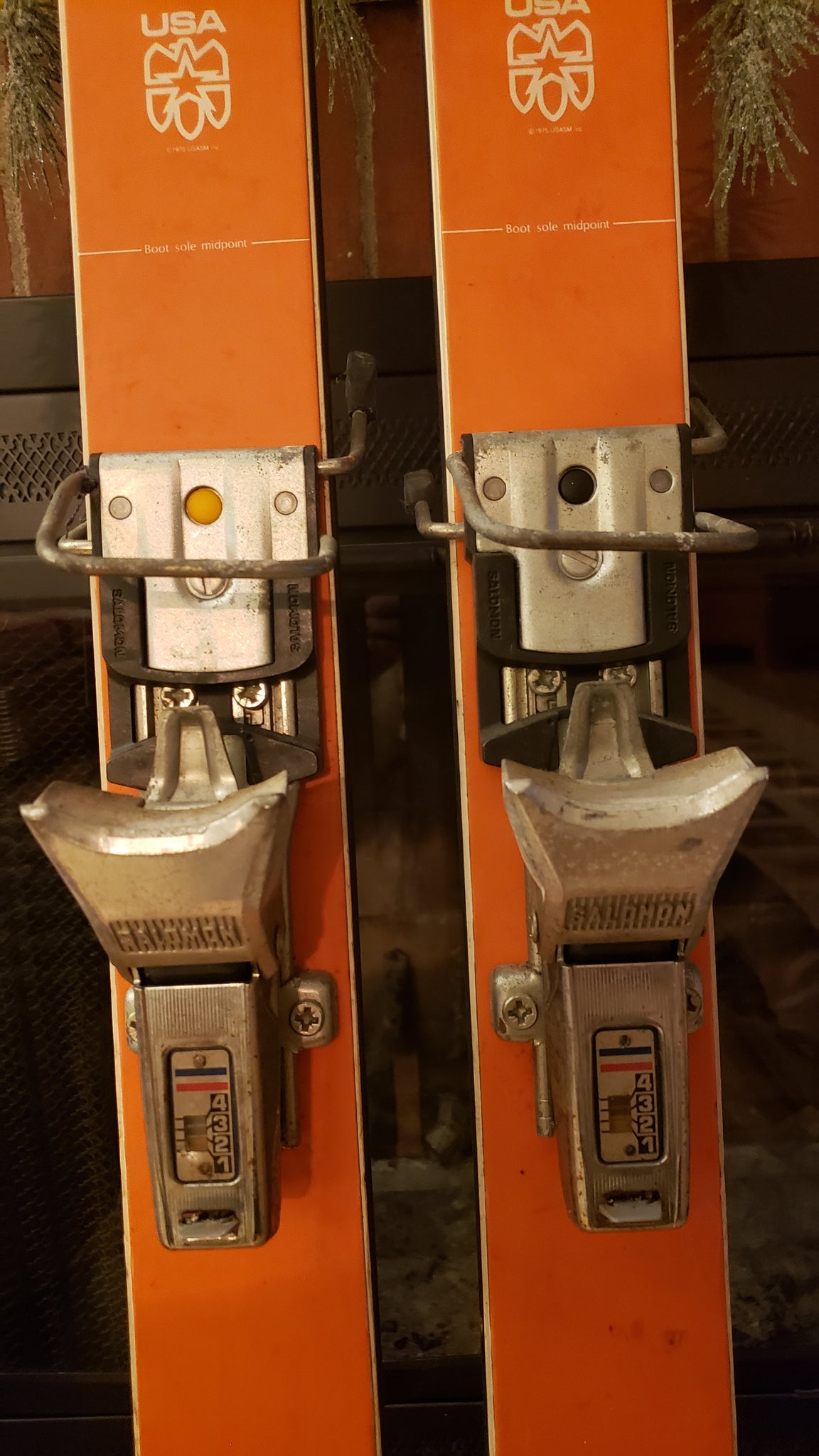 This pair of OLIN MARK IV COMP IV skis, serial number C30637, is an unmolested, pre-owned set preserved from typical repurposing such as ski chairs or coat racks. The skis retain their original orange and blue color scheme, emblematic of the era and model. The included Salomon S444 bindings are considered suboptimal and are recommended to be replaced with modern bindings such as the LOOK Pivot 15-18 for optimal performance. The edges show signs of rust and will require tuning, including knocking back the edges to restore proper function. With a fresh set of bindings and edge maintenance, these skis are ready to be ridden or displayed as vintage ski memorabilia.