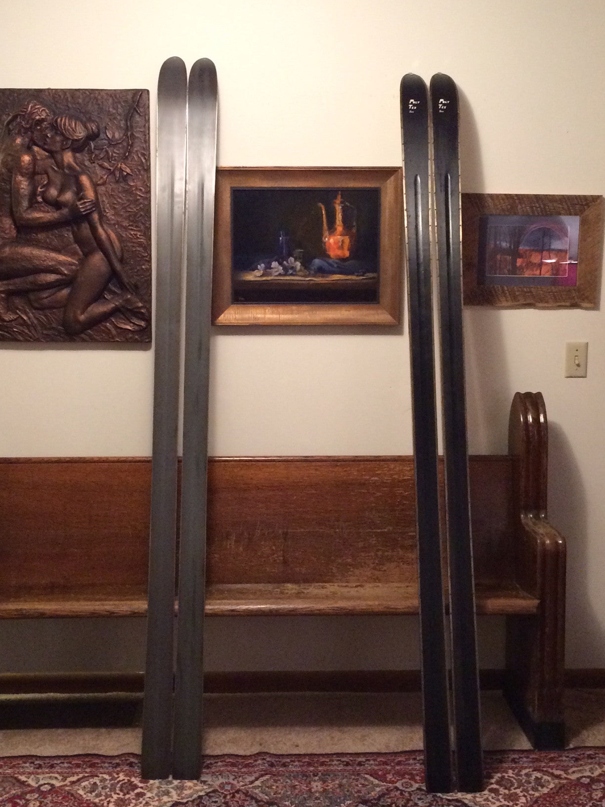 The skis play off each other's opposite coloration beautifully,